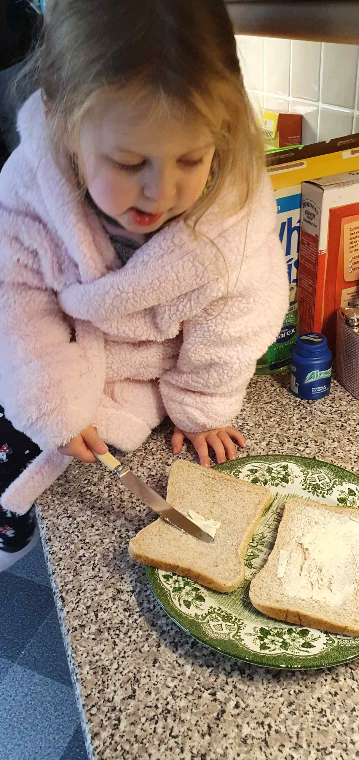 Come on Mums and Dads – let your child help to prepare the food for the picnic, especially with making the jam sandwiches! Messy!