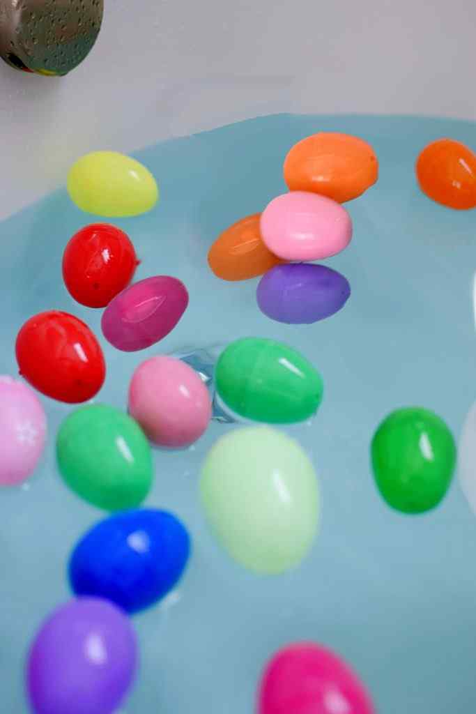 4. Eggs in the bath – use plastic eggs in the bath or sink and match together the two halves, talk about the colours, hide things inside them